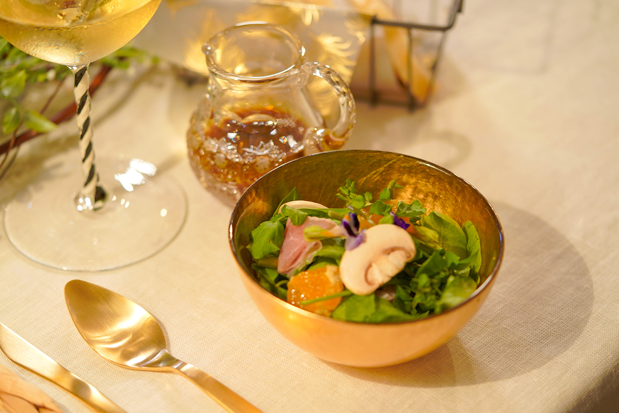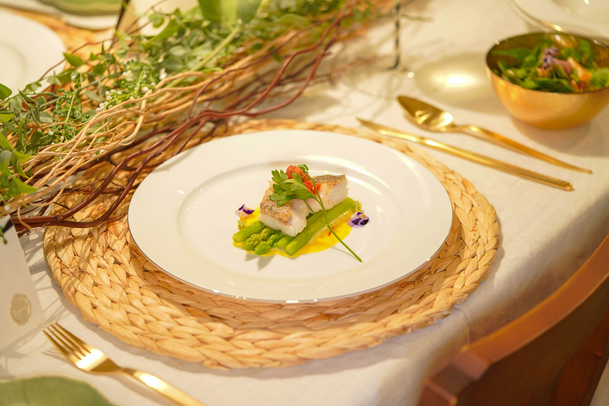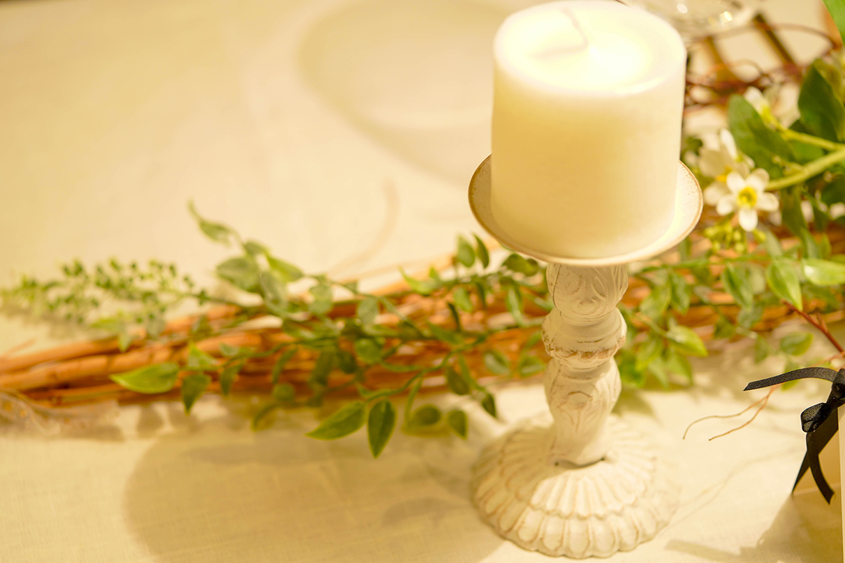 I imagined a bright dining table with clean white linen from Faux & Cachet Inc. Undercloth is also used to maximize the soft atmosphere.