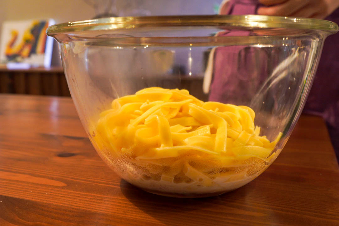 4 When the pasta is boiled, drain the water, put the pasta in the bowl of (3) and mix until the butter is dissolved.