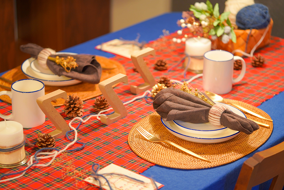 The tartan check cloth layered on top creates a relaxed atmosphere by letting the cloth fray without sewing.